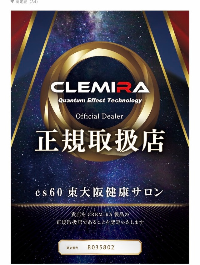 CLEMIRA PHOENIX (クルミラフェニックス) 当店オリジナル購入特典付き ※当店は【クルミラ正規取扱店】です。ご安心ください。 名称は不死鳥フェニックスに由来。 スポーツよりも病中病後での使用を想定しています。病気や怪我でお辛い方々の奇跡の復活や、死の淵から生還していただきたいとの想いから名付けました。健康で元気な方が装着すると、エネルギーに余力が生まれて細胞が量子レベルで元気になり若返りを目指せます。 クルミラ製品 エビデンス 単盲検試験報告書 第三者機関により、効果が確認されています。 https://rs9.jp/evidence/evid.htm CLEMIRA PHOENIX (クルミラフェニックス)の特長 ※こちらの商品はフィジカル用にチューニングした携帯専用モデルです。 ※CLEMIRAエネルギーの濃縮技術の開発に成功したことで、軽量コンパクトながらなんと現行のCLEMIRAアスリートの5個分に匹敵します! ※紛失防止にストラップを付けて着用することを推奨します。 CLEMIRA athlete5個分 自社テストとモニターテストで以下が確認されています。 【フィジカル】 ・身体機能の向上 ・柔軟性の向上 ・筋力の向上 ・スポーツ記録の向上 ・睡眠、肩こり、歩行などの改善 (多数の個人の感想です) 【その他】 ・飲食物の味わいの変化 ・植物の生育の向上 CLEMIRAのしくみ 新開発のCLEMIRA 真CORE TECHNOLOGYを施したコアが封入され、さらに究極の新技術CLEMIRA CORELESS TECHNOLOGYを施したケースから発する”量子のふるまい”によってあらゆる物質が活性化されると考えられています。 触れたり近づけたりした物にエネルギーを与え、様々な効果が得られます。まさにフェニックスモデルにふさわしいパワーを発揮します。 ◆使用法◆ スポーツや就労時、就寝時に身に着けてご使用ください。CLEMIRAは一定期間着用すると体が効果を覚えますので外した後もある程度効果は残ります。万一不調を感じた場合には使用を中止し医師にご相談ください。 ◆クルミラフェニックスがお勧めの方◆ ・クルミラアスリート5個分の効果を求める方 ・病気や怪我でお辛い方 ・体力の衰えが気になる方 ・疲れにくい身体になりたい方(毎日の疲労感を軽減したい) ・いつまでも健康で若々しくいたい方 ・血流を改善したい方 ・電磁波が気になる方 ・精神を安定させたい方 ・集中力をアップさせたい方 ・運気や波動を上げたい方 ・睡眠などのお悩みがある方 ・浄化したい方 ・人の身体に触れる仕事をしてる方 ・取り憑かれやすい方 ・体温を上げたい方 ・自律神経を安定させたい方 ・ゴルフなどスポーツをしてる方 ・トレーニング効果を上げたい方 ・歩きにくい方 ・柔軟性を上げたい方 ・体感を安定させたい方 ・犬や猫などペットの健康が気になる方 ・ソマチッドを活性化させたい方 ◆製品保証について◆ 購入日から6ヶ月の製品保証が付いております。 ※交換は1回のみとさせていただきます。 ・正常な使用状態で効果の減少などがあった場合には無料で交換いたします。 ・第三者より譲渡、購入された商品は保証対象外となります。 ・保証期間内であっても突発的、外来的な事案による破損や紛失については有料となります。 ◆本体サイズ◆ 縦 47mm 横 85mm 厚さ 15mm 重量約 42g ◆取り扱い法◆ 強い衝撃を与えないでくださいケースが破損します。 多少の水濡れは問題ありませんが生活防水程度の耐水レベルです。濡れた場合はよく乾かしてからご使用ください。 ◆購入特典◆ 今現在、クルミラ正規取扱店(東大阪健康サロン)でクルミラフェニックスをご購入して頂く方には、特別な特典が漏れなく付いております。 ①遠隔波動調整30日間 AWG(段階的波動電子発生装置)を使用し、30日間毎日(1日3時間程度)遠隔で波動調整を行います。波動調整することで免疫力アップ・ソマチッドの活性化・松果体の活性化・血液を弱アルカリにする・精神の安定など様々な健康効果が期待できます。 遠隔で行うため、日本全国どこにいても波動調整できます。 遠隔波動調整と聞くと、「信じられない」と耳を疑ったり、疑心暗鬼される方も多いかもしれません。しかし、このことを理解するための鍵が量子力学にあります。遠隔波動調整は特典としておまけでつけていますので、よかったら試してみてください。 ②フォトンビーム遠隔 フォトンビームは光子発生・酸化還元装置です。 フォトンビームを照射すると、大量の電子が生成されます。これらの電子は細胞内のミトコンドリアによって取り込まれ、生命エネルギーであるATPの生成に利用されます。これにより、細胞レベルからエネルギーが活性化する仕組みです。 実験結果によれば、フォトンビームの照射後、ミトコンドリアの活性が40億倍にまで高まることが確認されました。照射後には身体の状態が正常化し、免疫系も適度に高い活性状態に戻ることが確認されています。光子の効果によって、細胞レベルから活性化し、健康と若々しさを維持することが可能となります。 フォトンビームの照射を遠隔でさせていただきます