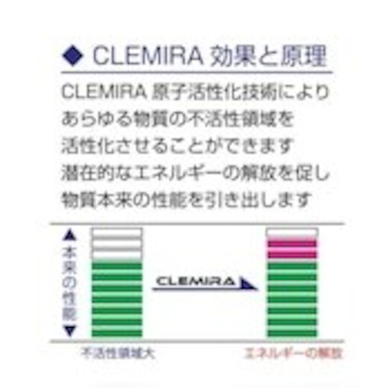 新開発のCLEMIRA 真CORE TECHNOLOGYを施したコアが封入され、さらに究極の新技術CLEMIRA CORELESS TECHNOLOGYを施したケースから発する”量子のふるまい”によってあらゆる物質が活性化されると考えられています。触れたり近づけたりした物にエネルギーを与え様々な効果が得られます。まさにアスリートモデルにふさわしいパワーを発揮します。